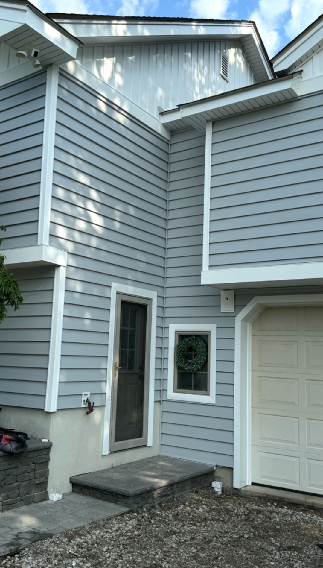 Vinyl is cost-effective, low-maintenance, and comes in many colors. Fiber-cement is heavier, very durable, and offers a painted look with sharp shadow lines. We’ll price both.